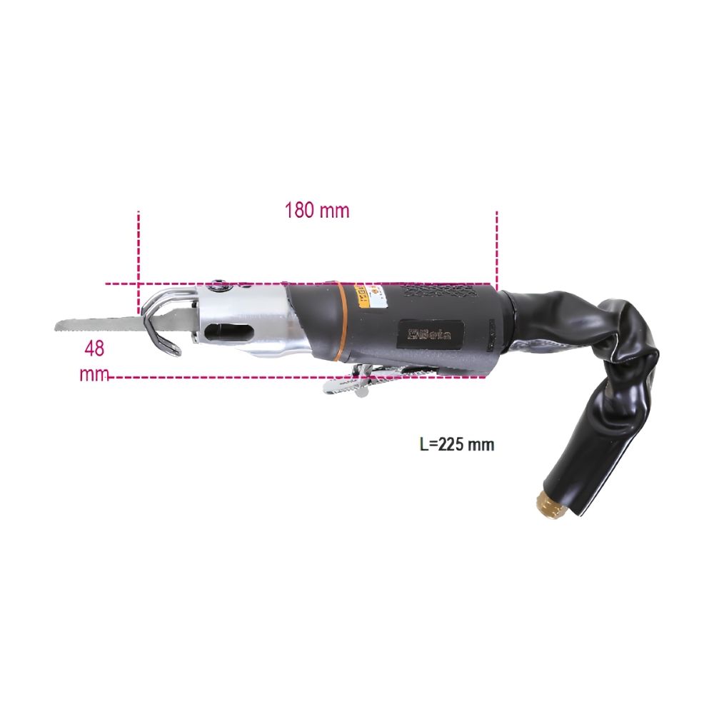 A serra pneumática 1942A é uma ferramenta poderosa e versátil, projetada para cortar tubos de escape, silenciadores, alumínio e plástico. Equipada com um cabo de borracha, tubo de escape, e mangueira de alimentação de ar em PVC, esta serra garante um desempenho eficaz e confiável.