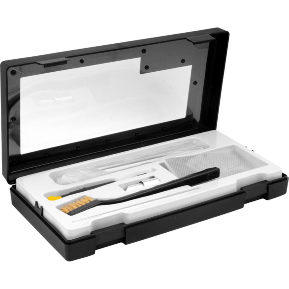 1 Conjunto para solda plástica. Composto por: 1 estojo plástico, 1 ponteira de alumínio, 1 chave phillips, 1 escova para limpeza com cerdas de latão, 1 haste com ponta recartilhada para limpeza, 3 telas/malhas de aço, 3 varetas ABS pretas, 3 varetas ABS brancas, 3 varetas polietileno (PE) pretas, 3 varetas polietileno (PE) brancas, 3 varetas poliestireno (PS) pretas, 3 varetas poliestireno (PS) brancas, 3 varetas polipropileno (PP) pretas e 3 varetas polipropileno (PP) brancas.