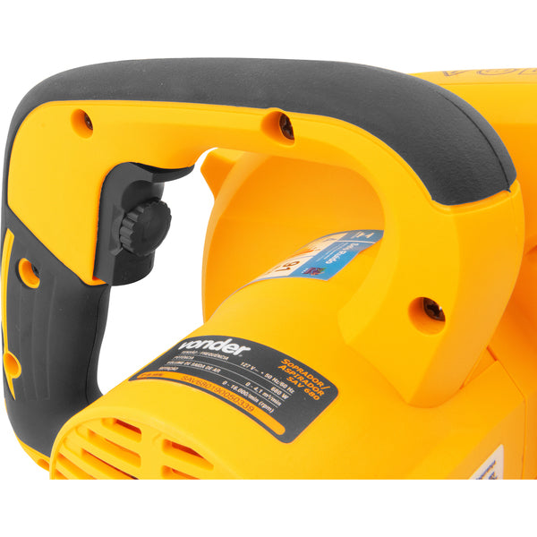 Possui interruptor eletrônico com pré-seleção de velocidade, que permite controlar a rotação do aparelho, e botão trava do interruptor para trabalhos contínuos. Conta também com motor com dupla isolação, que garante maior segurança ao operador, e empunhadura emborrachada para um maior controle e conforto.