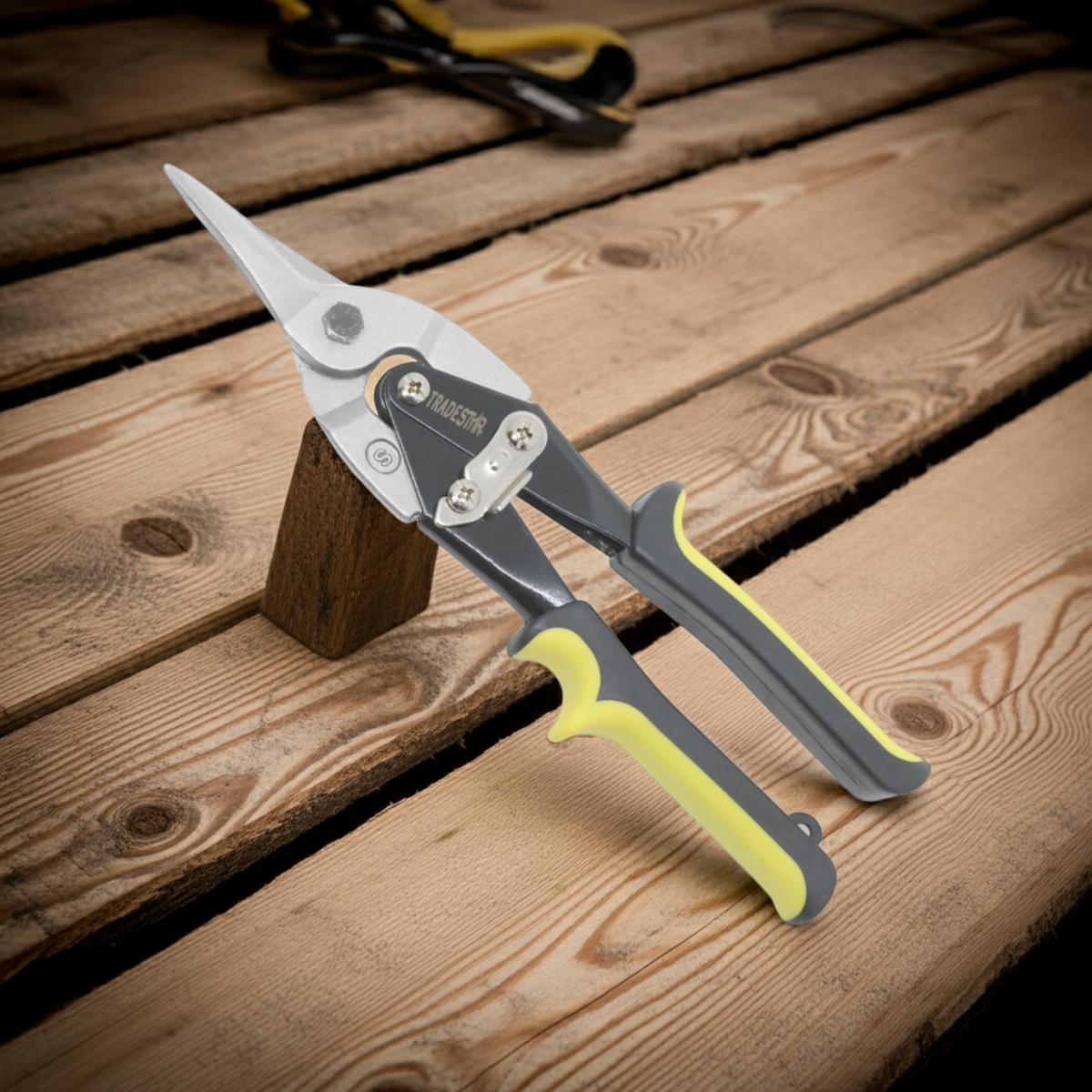 A Tesoura Corta Chapa 10" Tradestar Aviação Reta é uma ferramenta essencial para funileiros, mecânicos e profissionais que trabalham com chapas de metal. Projetada para cortes precisos em ângulos retos, esquerda ou direita, combina robustez e ergonomia, oferecendo controle seguro durante o uso. Ideal para cortar chapas de aço laminado e inox com eficiência, garantindo acabamento limpo e consistente.