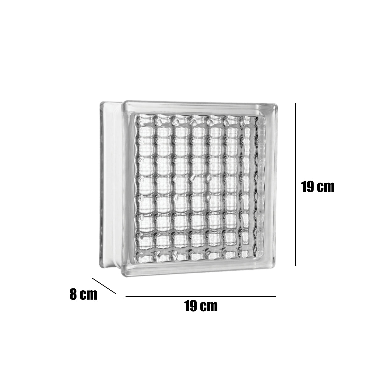 Produzido em vidro de alta qualidade, totalmente incolor, garante máxima transparência e resistência, sendo adequado tanto para paredes internas quanto divisórias decorativas. Seu formato padronizado de 19 x 19 x 8 cm possibilita instalações precisas e harmoniosas, valorizando qualquer projeto residencial ou comercial.